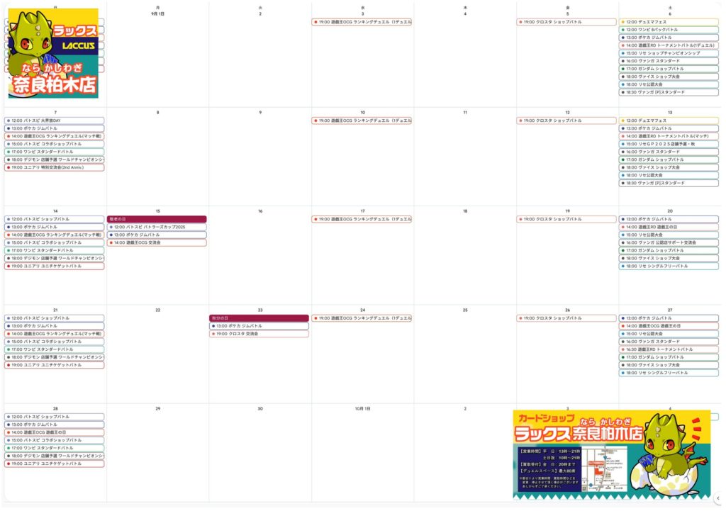 2025年9月🍄🌛 ラックス奈良柏木店 のカードゲーム イベント・大会カレンダー✨です!